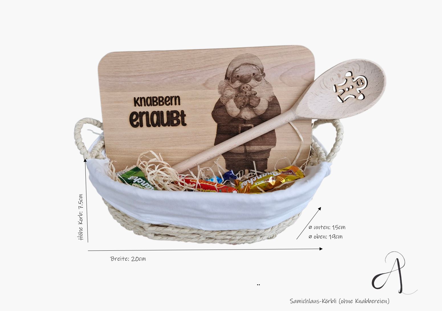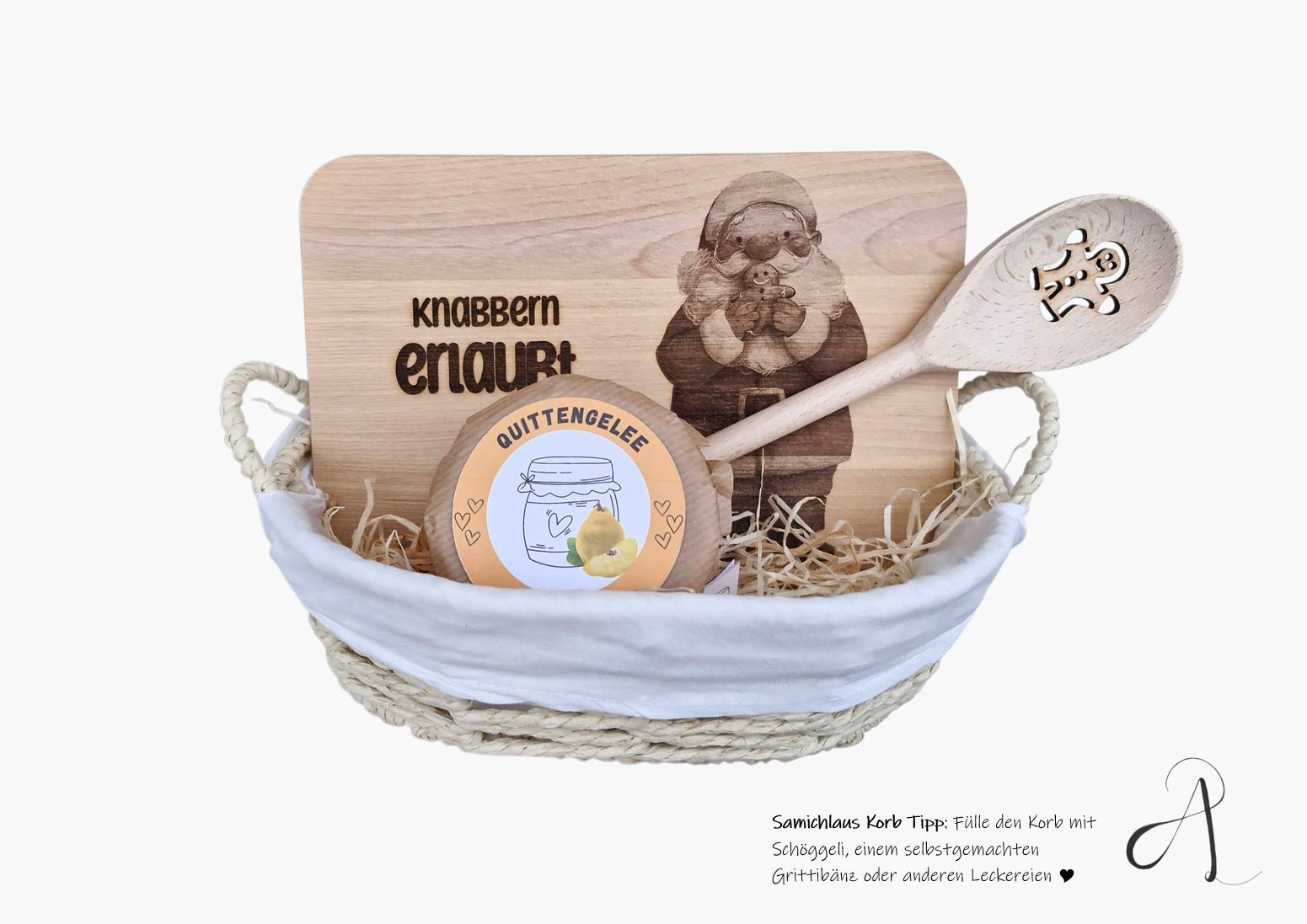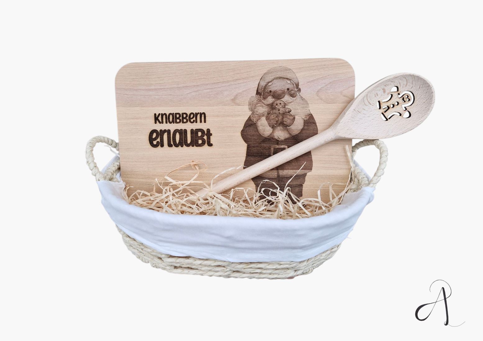 Ergänzt wird der Korb durch einen dekorativen Holzlöffel –