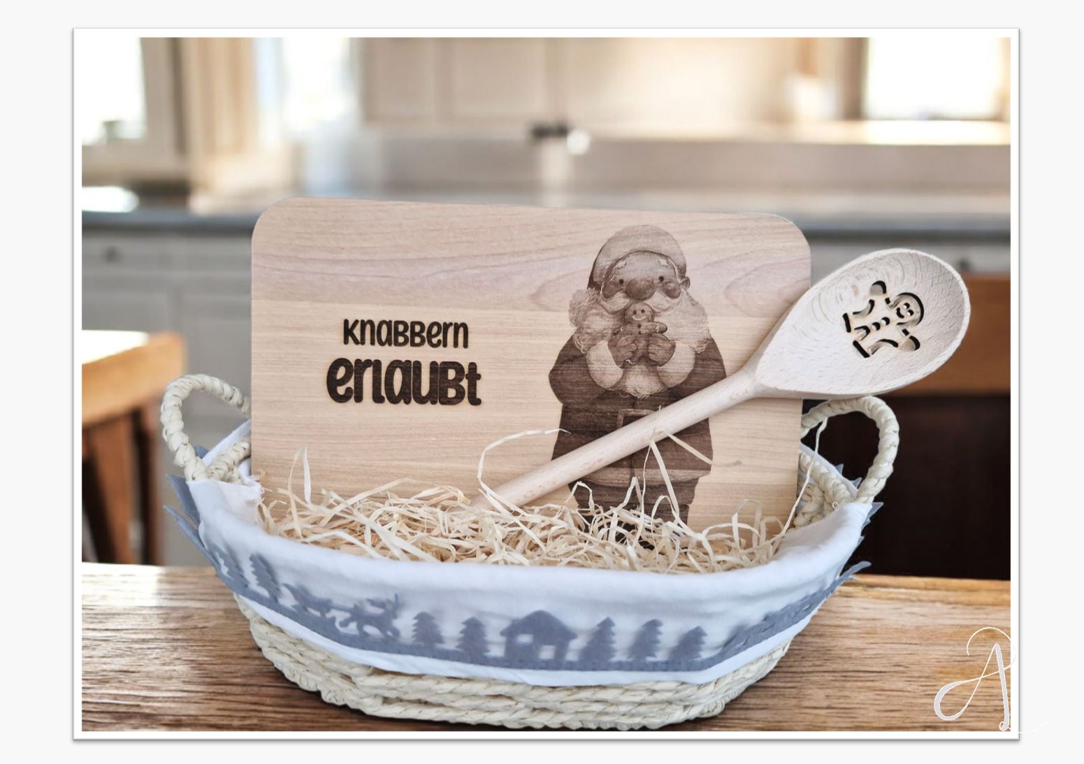1x Brotkorb inkl. Deko Stroh, 1x Holzlöffel, 1x Schneidebrett